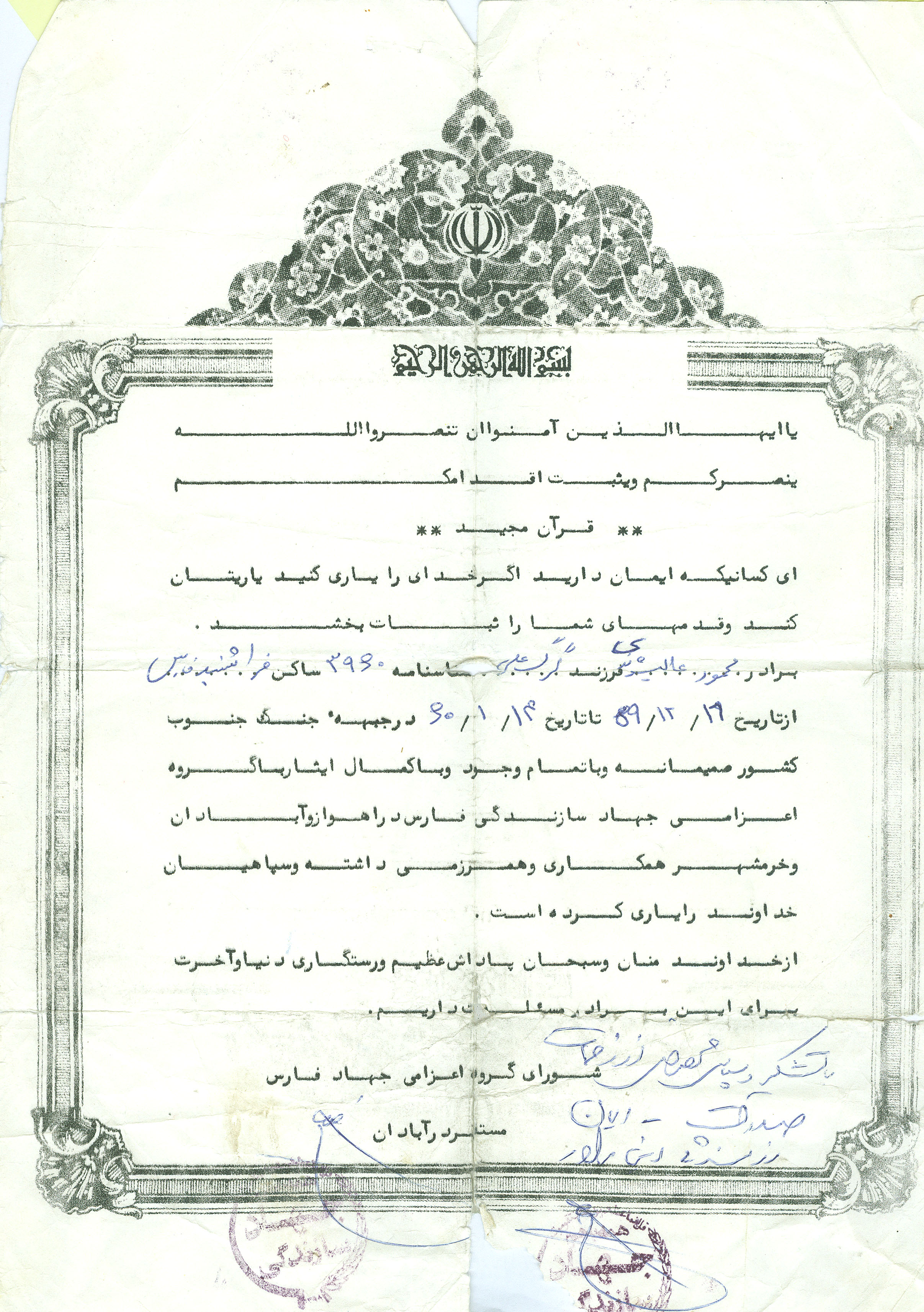 سلام بر مهدی (عج) سلام بر نایبش امام خمینی، سلام بر شهیدان و درود بر تمام مسلمین جهان، مادر وپدر عزیزم اگر شهید شدم برایم گریه نکنید چون من خود می خواستم و وظیفه ام بود. خدا من را به شما داد وظیفه شما بود که مرا تربیت کنید و کردید، پس ناراحت نباشید. پیام من به ملت ایران این است که با گروهک های منافق بجنگید و نابودشان کنند و راه شهیدان را ادامه دهند. پیام من به دولت این است که امام و شخصیت های مملکتی را از هر نقطه حفظ کنند تا ریشه آمریکا کنده شود. تمام ملت باید گوش به فرمان امام باشد زیرا که نائب امام زمان است. امیدوارم که تا به حال گناهی کرده ام خدا مرا ببخشد و مرا جزء یاران امام زمان گرداند....