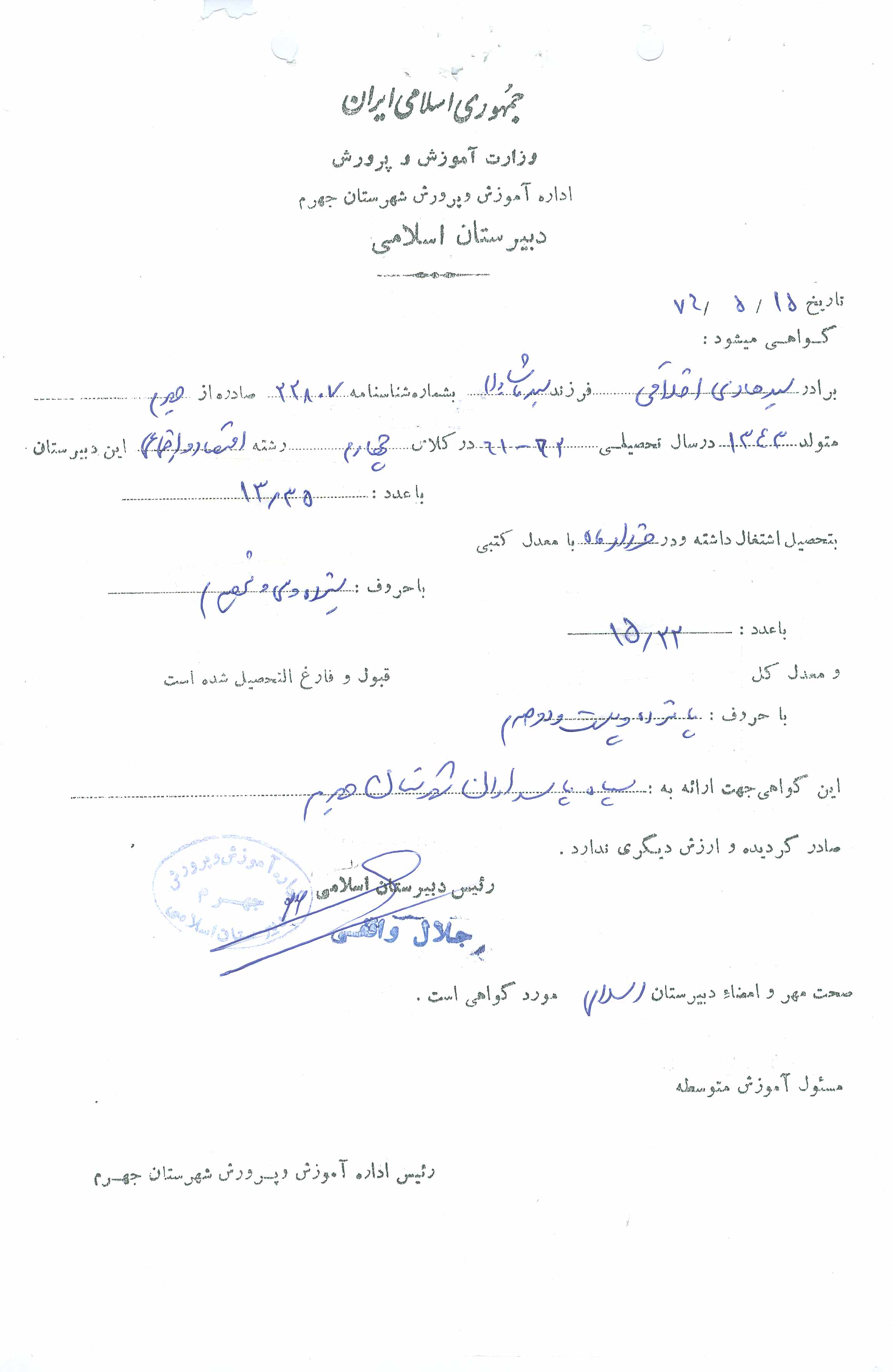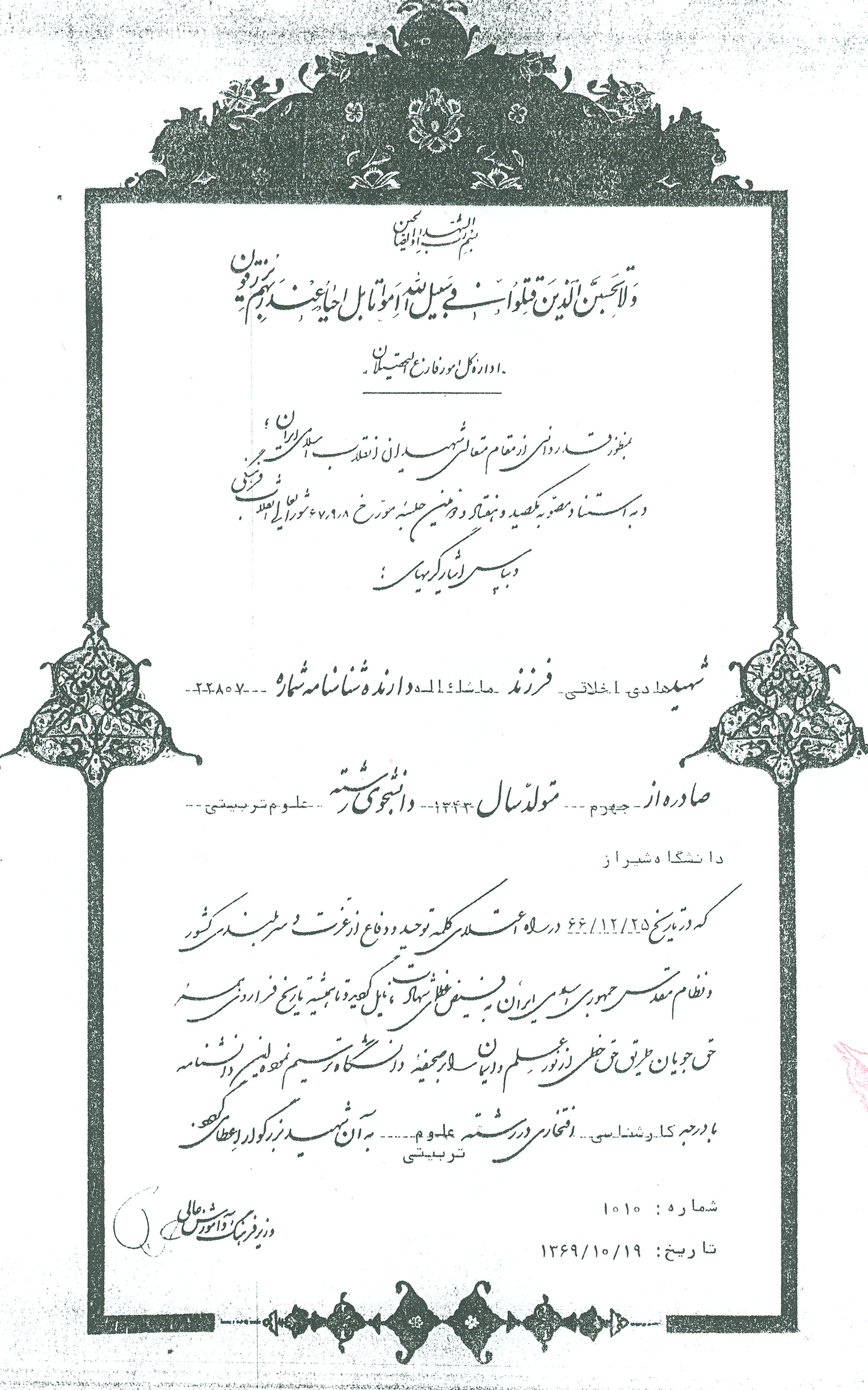 وصیت نامه شهید سلام بر مهدی (عج) سلام بر نایبش امام خمینی، سلام بر شهیدان و درود بر تمام مسلمین جهان، مادر وپدر عزیزم اگر شهید شدم برایم گریه نکنید چون من خود می خواستم و وظیفه ام بود. خدا من را به شما داد وظیفه شما بود که مرا تربیت کنید و کردید، پس ناراحت نباشید. پیام من به ملت ایران این است که با گروهک های منافق بجنگید و نابودشان کنند و راه شهیدان را ادامه دهند. پیام من به دولت این است که امام و شخصیت های مملکتی را از هر نقطه حفظ کنند تا ریشه آمریکا کنده شود. تمام ملت باید گوش به فرمان امام باشد زیرا که نائب امام زمان است. امیدوارم که تا به حال گناهی کرده ام خدا مرا ببخشد و مرا جزء یاران امام زمان گرداند....