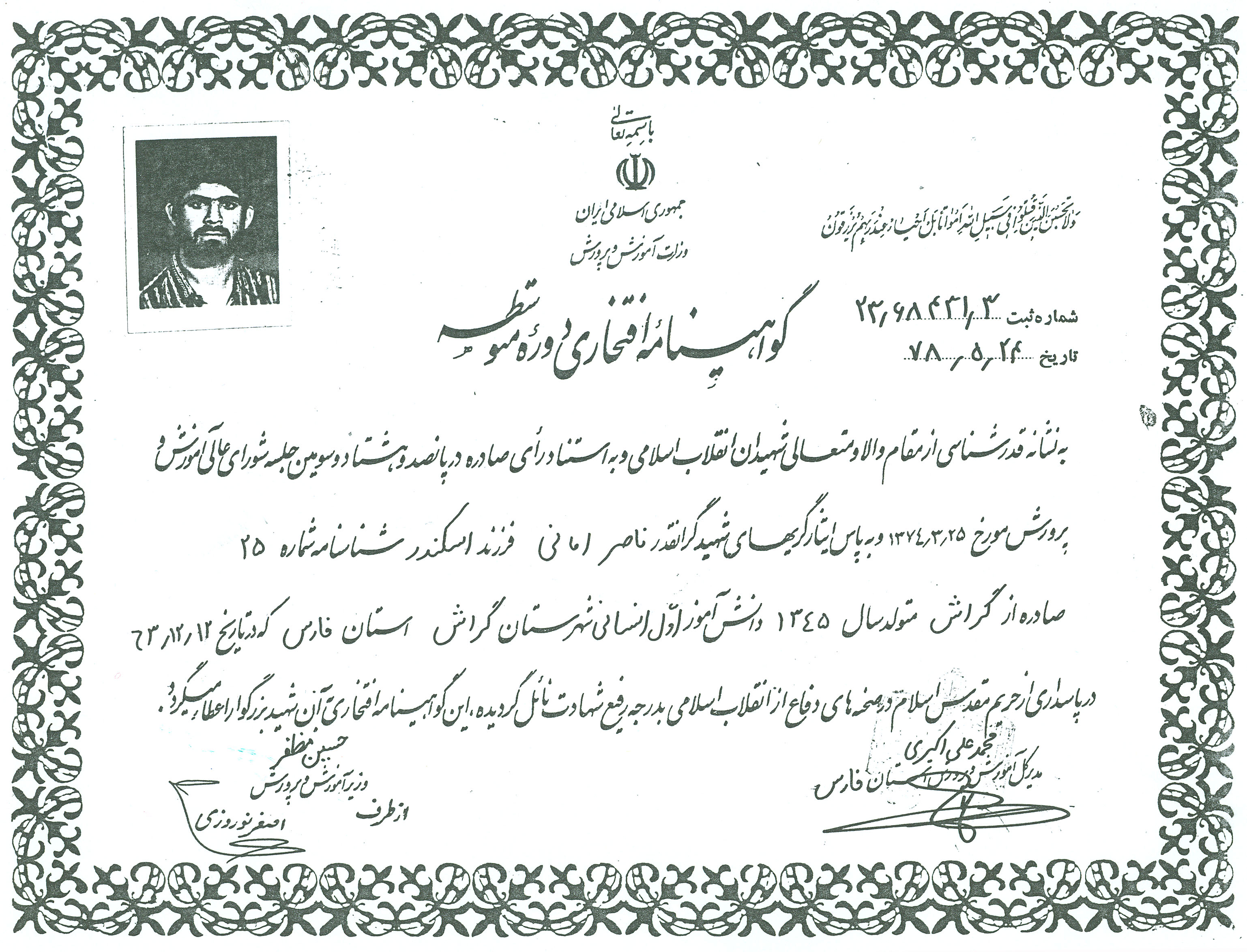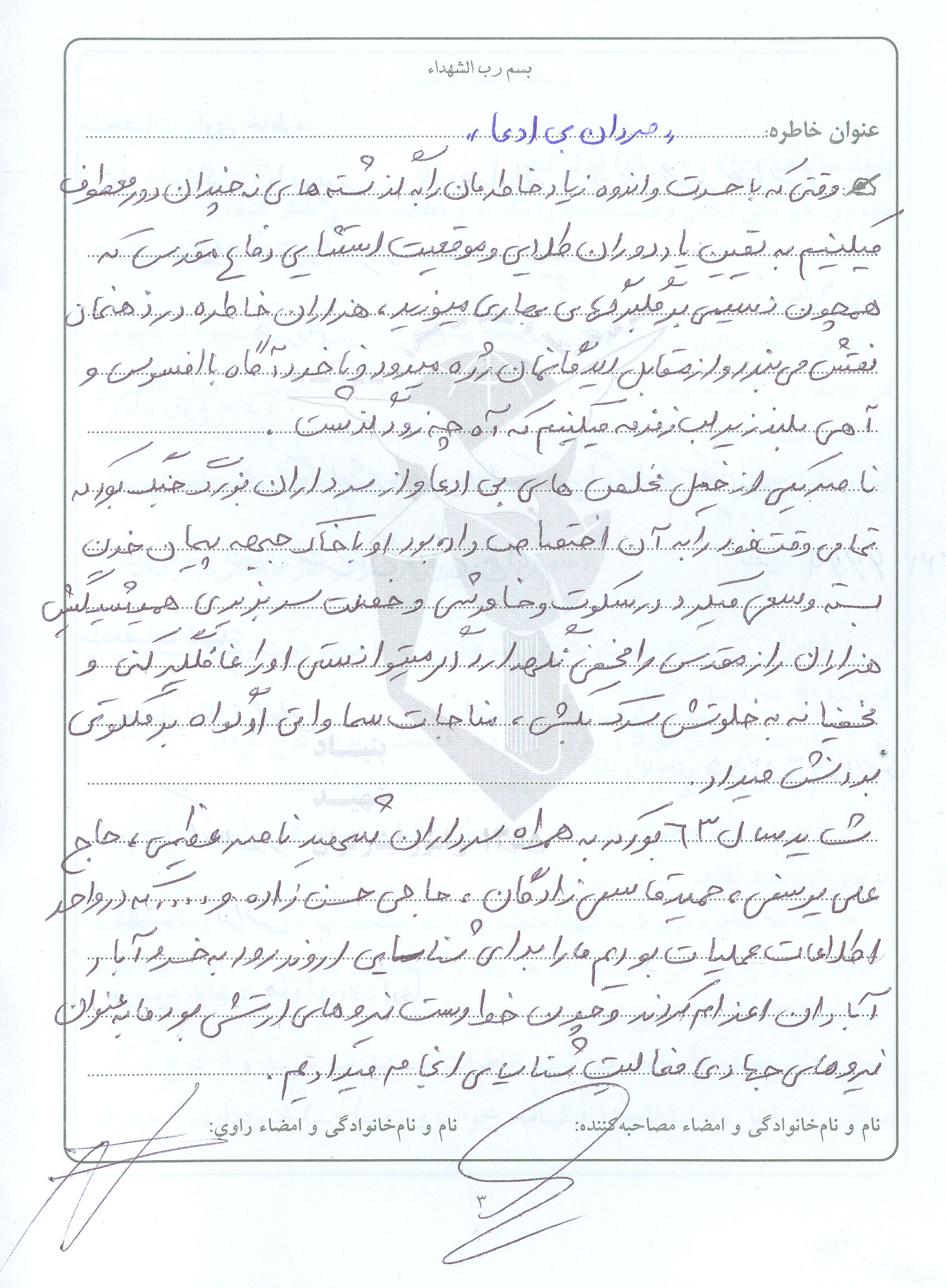 وصیت نامه شهید سلام بر مهدی (عج) سلام بر نایبش امام خمینی، سلام بر شهیدان و درود بر تمام مسلمین جهان، مادر وپدر عزیزم اگر شهید شدم برایم گریه نکنید چون من خود می خواستم و وظیفه ام بود. خدا من را به شما داد وظیفه شما بود که مرا تربیت کنید و کردید، پس ناراحت نباشید. پیام من به ملت ایران این است که با گروهک های منافق بجنگید و نابودشان کنند و راه شهیدان را ادامه دهند. پیام من به دولت این است که امام و شخصیت های مملکتی را از هر نقطه حفظ کنند تا ریشه آمریکا کنده شود. تمام ملت باید گوش به فرمان امام باشد زیرا که نائب امام زمان است. امیدوارم که تا به حال گناهی کرده ام خدا مرا ببخشد و مرا جزء یاران امام زمان گرداند....