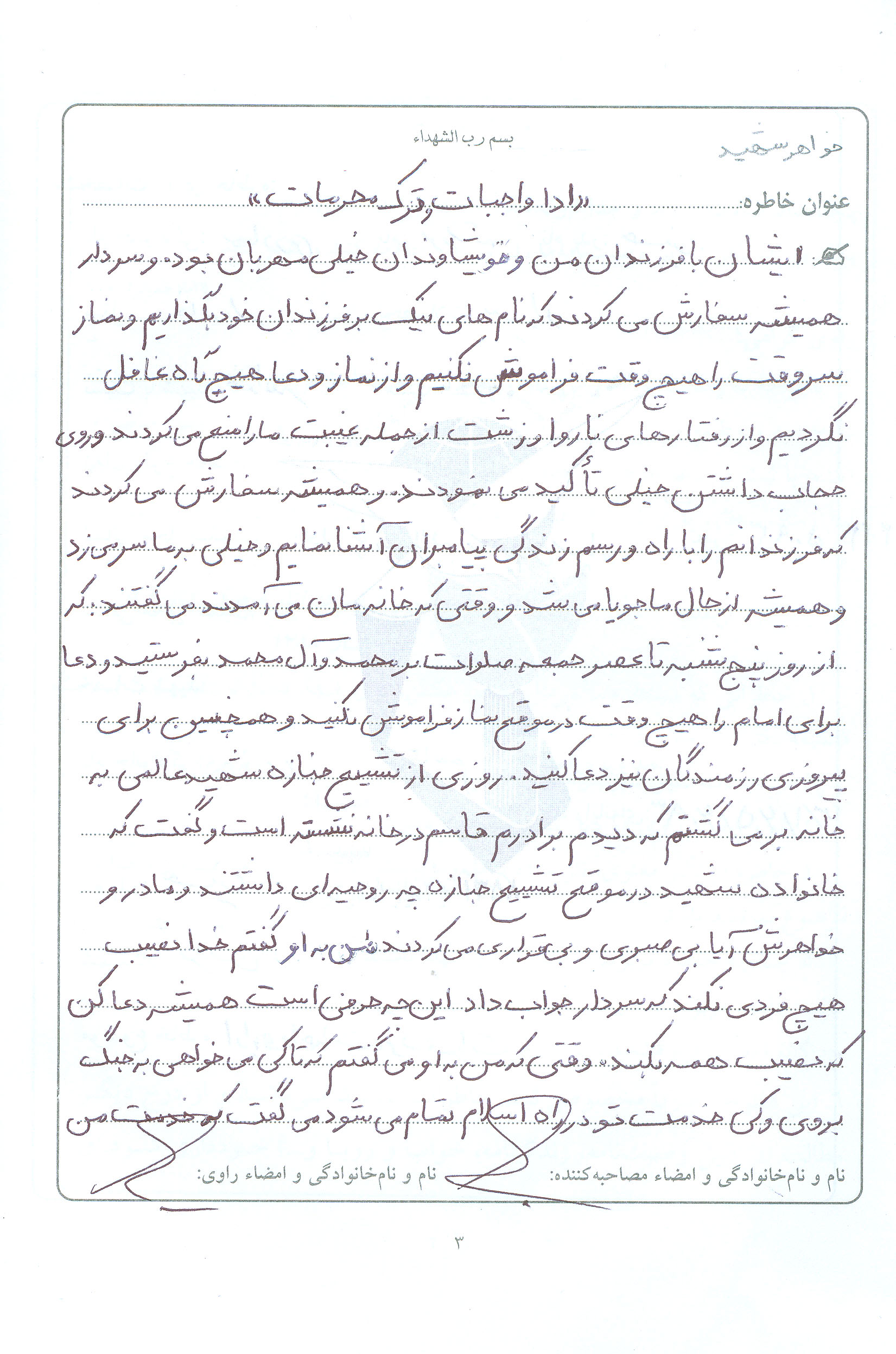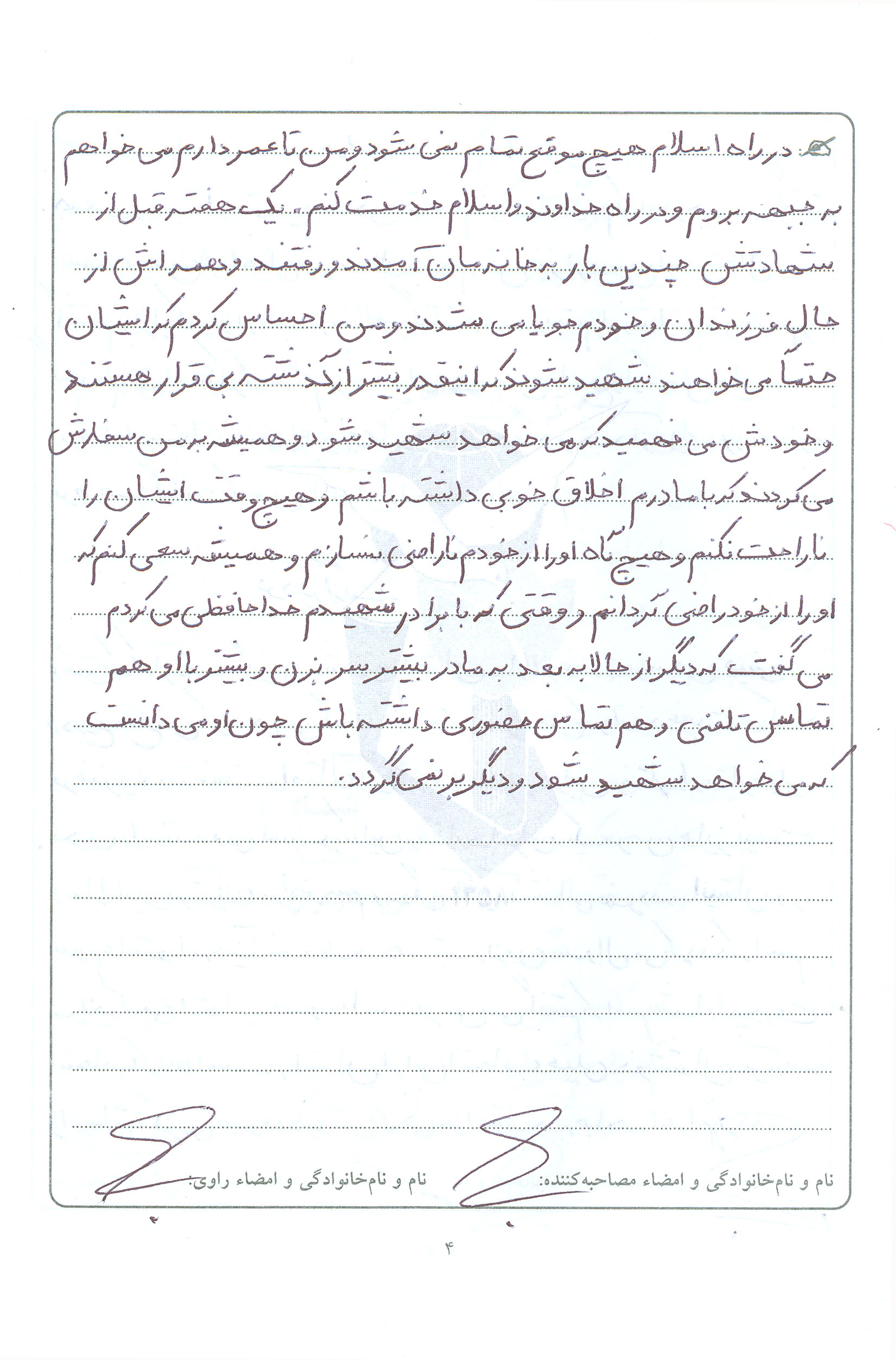 "من بر اساس رسالت و مسؤولیتی که احساس نمودم ، در راه الله و برای پاسداری از انقلاب کبیر اسلامی که خونبهای هزاران شهید و معلول است به طور داوطلبانه به جبهه رفته و به جنگ علیه ضد خدا پرداختم . من گام نهادن در این مسیر خدایی را یک فریضه می دانم . به امید جهانی شدن اسلام عزیز."