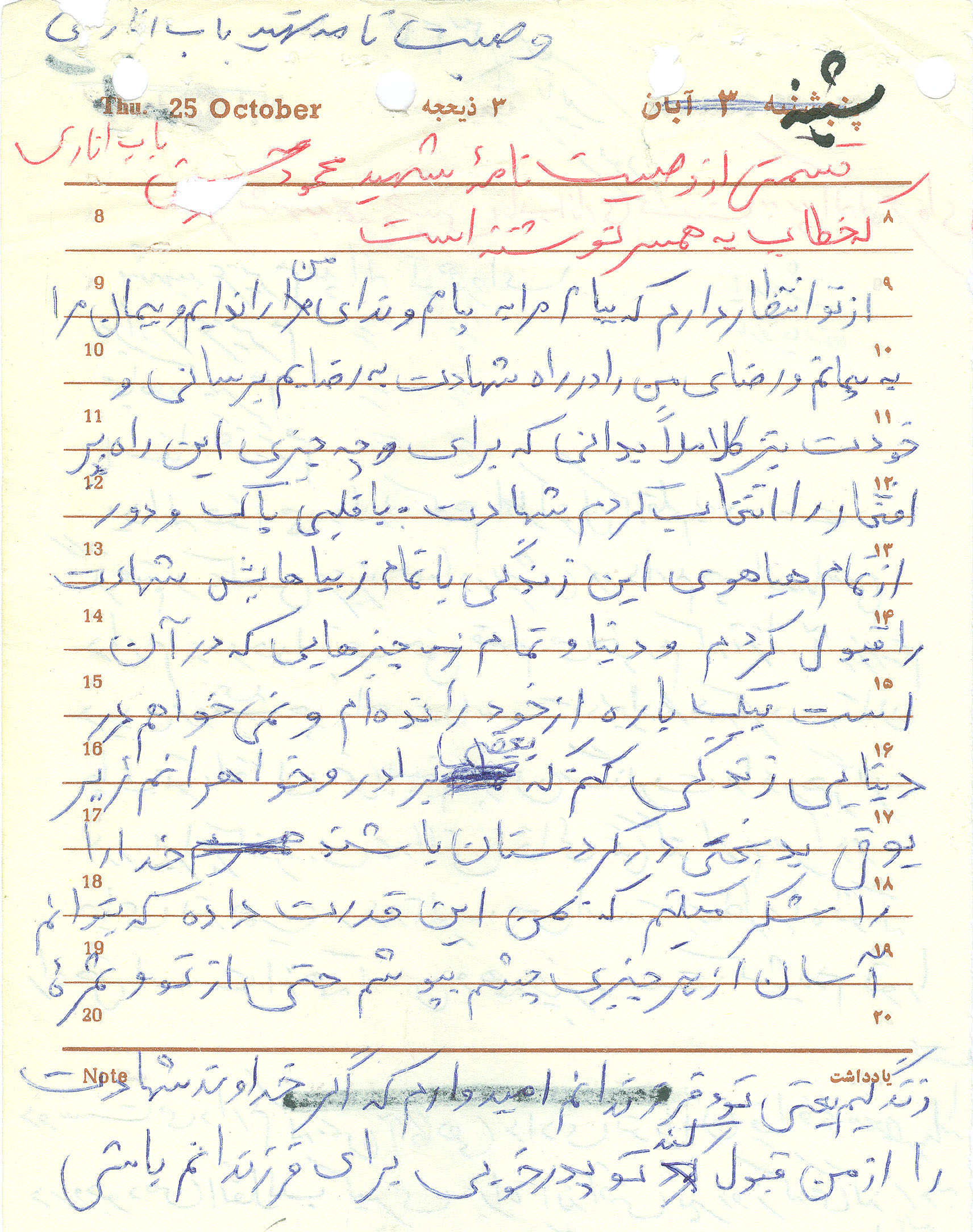 بسم الله الرحمن الرحیم وصيت نامه شهيد محمود حسيني باب اناري بعد از ياد خدا سالم به تمام دوستان و آشنايان اميدوارم که قبل از اين که بفکر جاي خالي من باشيد کمي بفکر خود و خداي خود باشيد و در تمام مراحل خداي را از ياد نبريد و فراموش نکنيد که براي چه چيزي به دنيا آمده ايد و چه ماموريتي داريد باري من در عين صحت و سالمت اين وصيت نامه را نوشتم.من در زندگاني چيزي براي فرزندانم از مال دنيا باقي نگذاشتم که قابل تقسيم باشد هر چيزي که هست از قبيل خانه و مقداري طلب کاري که آن هم که بين زن و فرزندم تقسيم مي شود فقط تا زماني که بخواهند در آن زندگي مي کنند و تماما ً به همسرم جهت زندگي مي رسد و در مورد فروش و تعويض آن اختيار دارند که با مشورت برادرم حسن و همسر انجام ؟؟؟ نمايند و حال چند کلمه اي با فرزندم من علم و آگاهي دارم که براي تربيت شما نياز به مال دنيا نداريد و خداوند قادرست که مخارج روزمره زندگي شما را برساند مخصوصا در حکومت اسالمي جاي هيچ گونه نگراني نيست فرزندان عزيزم هر چند که حال شما کودکاني بيش نيستيد ولي در آينده به ياري خدا شما بايد روي من قضاوت کنيد بدانيد و آگاه باشيد که من ؟؟؟ خودم مانند دائي بزرگوارتان شهيد يداهلل با رضايت قلبي خودم و داوطلبانه رفتم که روزي شما خودم را از چنگال شيطان و اين زندگاني نجان دهم و شايد توفيق شهادت نسيبم گردد و بدانيد و آگاه باشيد که شهادت بزرگترين آرزوي قلبي من بود و اگر به خواست خدا شهيد شدم به بزرگترين آرزوهايم ؟؟؟ و مرز بشريت رسيدم خداوند اين خون سرخ و گرم مرا در راه وطن و هم وطنانم و اسالم عزيز از من قبول کند. فرزندانم هيچ گاه در زندگي فريب زرق و برق دنيا را نخوريد و هميشه ؟؟؟ مال و منا دنيا بدانيد هيچ گاه بفکر اندوخت فراوان نباشيد که پستي مي آورد و تا آنجا که ؟؟؟ امکان دارد در آمد خود را با مردم ؟؟؟ و عزيز خدا و کمي هم در آمد شريک باشيد هميشه براي خودتان زندگي کنيد نه براي دل مردمهيچ گاه از روي چشم هم چشمي سعي به آراستن خود نکنيد به خدا قسم که اگر مي خواستم براي مال دنيا از ؟؟؟ باشيم هيچ گاه به اين صورت دنيا ترک نمي کرد و اندوخته من پيش تمام کساني بود که در سن و سال من بودند هميشه بر خودتان ؟؟؟ را بزرگ را برداريد و تا آن جا که امکان دارد براي خود از ؟؟؟ که ؟؟؟ به هنگام سفر به جاي غريب برويد قبل از آني که به سفر برويد و قبل از آن که دير بشود براي خود آشياني بسازيد در ابديت عزيزانم بدانيد و آگاه باشيد که زندگي در اين دنياي فاني اگر به شما خوش بگذرد و بدون درد و رنج و غم و اندوه از ايندنيا برويد و بدانيد که در رديف ستم کارانيد. فرزندانم سعي کنيد که خودتان و دانيد که ؟؟؟ هستيد و خودتان بدانيد که چه جاي در نزد خدا داريد و در زندگي ابديت جزء کدامين گروهيد هميشه خدا را شاهد و ناظر اعمال خوب و ؟؟؟ بگيرد و بدانيد هيچ گاه تنها نيستيد و هميشهخداوند ناظر اعمال خوب و بد شما هست نگذاريد که وقتي نامه اعمال شما را بدستتان مي دهند سر افکنده شود از اسالم فاصله نگيريد که خوشبخت در دو جهان خواهيد گشت نمازتان را اول وقت بخوانيد و کوچک نشماريد که راه سر منزل خوبختي است و خود را حاملي وطن و هم وطنانتان بدانيد و هميشه در راه خلق قدم برداريد آسوده نگريد در حالي که دوستان و برادران ديني شما در بند و گرفتاري بسر مي برند خدا حق من را به شما حالل کند. همسر خوب و مهربانم مريم اميدوارم که خدا حق ترا به گردن من و بچه حال کند تو هم حق زيادي بگردن من و فرزندانم داري اميدوارم که پيش از پيش در نگهداري بچه ها کوشش کني و پسرانم هم را پدراني منقد و متعهد بار بياوري و يگان دختر هم را مادر خوبي براي اجتماع و بگو که چقدر دوستش داشتم. خدانگهدار هميشگي شما